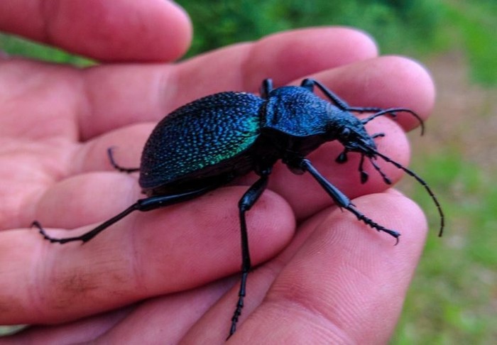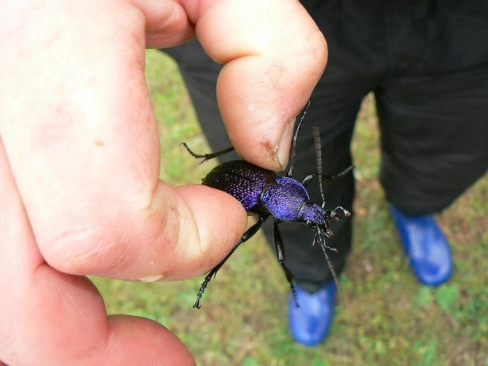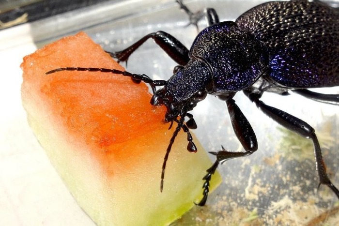 Эти жуки — воистину всем жужелицам князи. Размера они огромного — до 5 сантиметров, а то и больше. Окраса — царского: просто посмотрите, как переливаются на солнце их восхитительные ультрамариновые латы!
