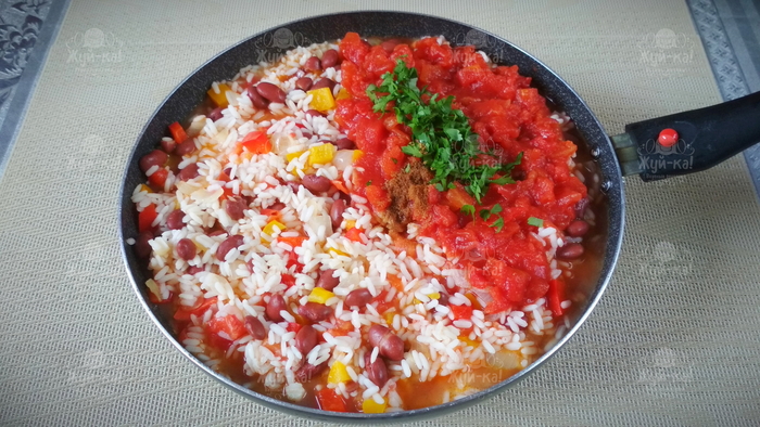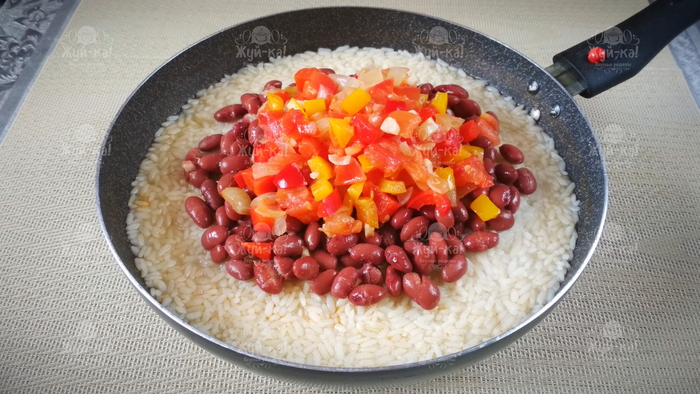 Теперь добавляем к рису фасоль и ранее приготовленные овощи: