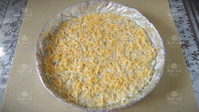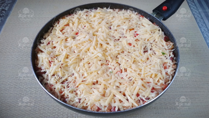 Твёрдый сыр натираем на средней тёрке и посыпаем им наше блюдо. Сковородку накрываем крышкой и тушим всё вместе ещё 10 минут. За это время сыр должен полностью расплавится: