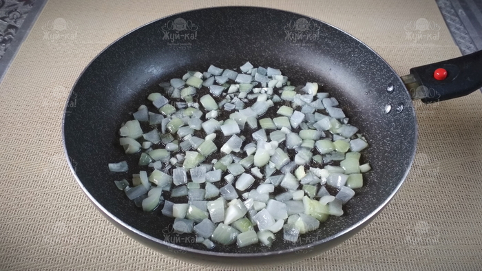 Лук нарезаем небольшими кубиками, чеснок мелко рубим. Хорошо разогреваем сковородку с растительным маслом. Обжариваем овощи буквально пару минут (до прозрачности лука):