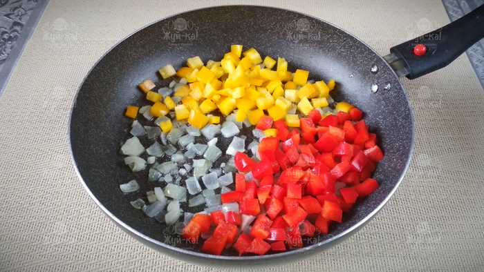 Добавляем сладкие перцы (нарезанные небольшими кубиками). Жарим тоже 2-3 минутки: