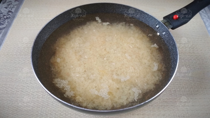 Перекладываем овощи в отдельную миску. В ту же сковородку наливаем 3 стакана воды, ждём пока закипит. Всыпаем рис, размешиваем, снова доводим до кипения. Затем переключаем конфорку на тихий огонь и готовим рис 10-12 минут:
