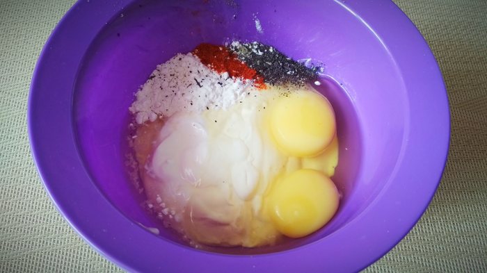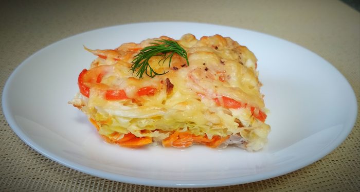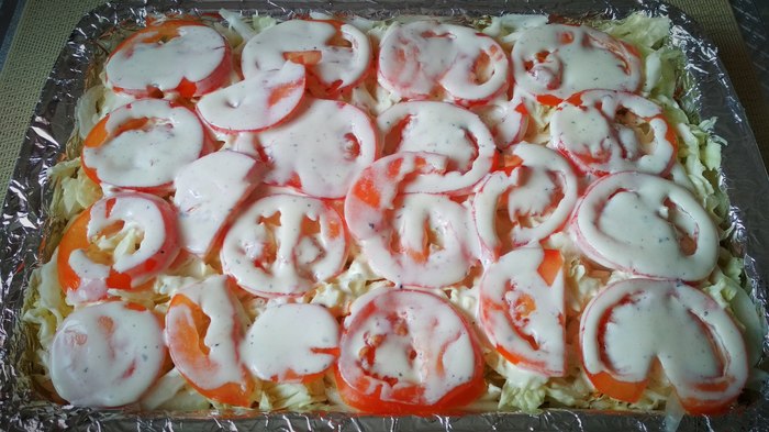 Сверху на сыре также делаем майонезную сеточку. Запекаем в духовке при 200° С 40-45 минут: