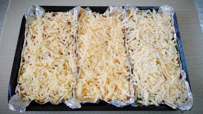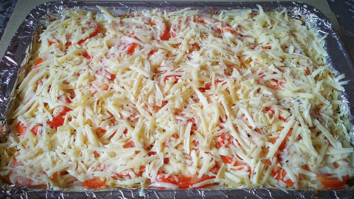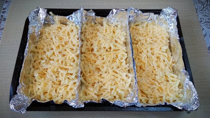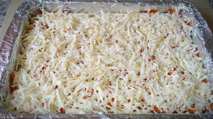 Посыпаем натёртым на средней тёрке сыром. Сыр можно предварительно убирать в морозильную камеру на час. Это делается для того, чтобы его легче было натереть: