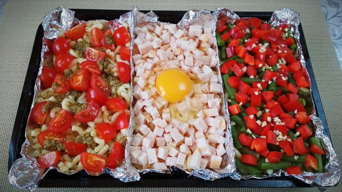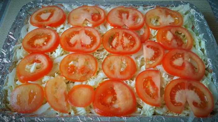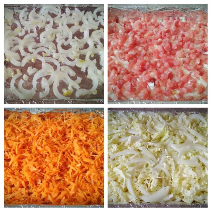 Нарезаем лук полукольцами. Раскладываем его на противне, предварительно застеленный фольгой и смазанный растительным маслом. Чуть-чуть присаливаем: