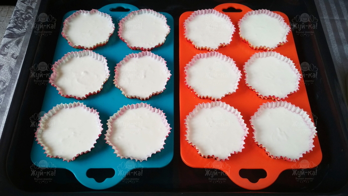 В центр каждой бумажной заготовки (на глянцевую сторону) кладём примерно 1,5 столовые ложки теста и распределяем по диаметру круга.