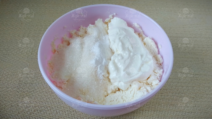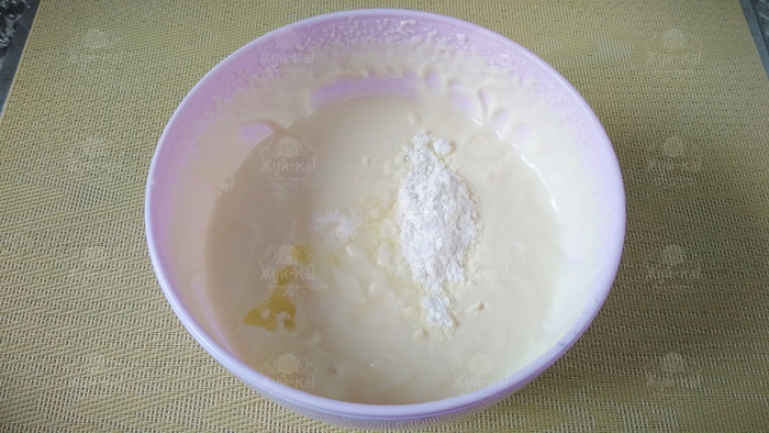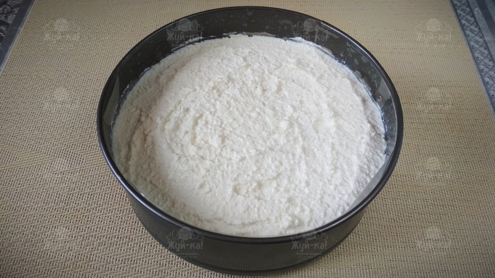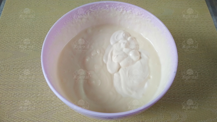 Готовое тесто по консистенции будет примерно как 15%-ая сметана. Оно должно медленно стекать с лопатки.