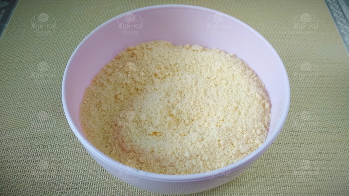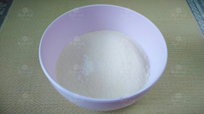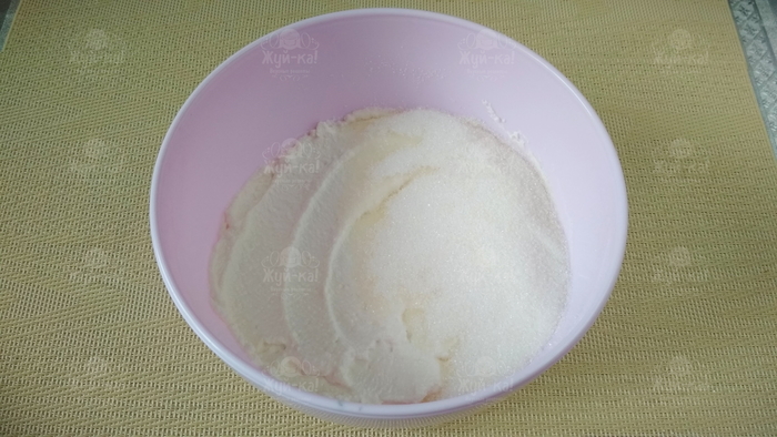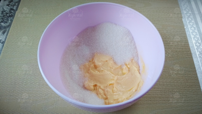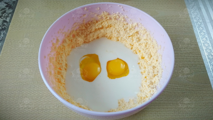Оставшийся сахар добавляем к желткам и взбиваем буквально 1 минуту (желток должен посветлеть):
