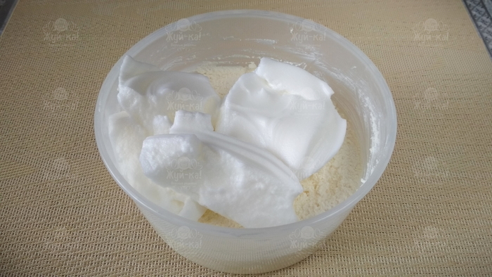 В два подхода добавляем к белкам желтки. Аккуратно перемешиваем уже не миксером, а лопаточкой (движениями снизу вверх):
