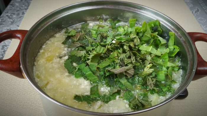 Осталось положить в суп крапиву, щавель и ранее приготовленный лук. Зелень добавляем в последнюю очередь для того, чтобы в ней сохранилось как можно больше витаминов: