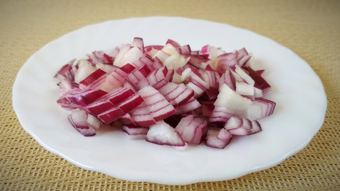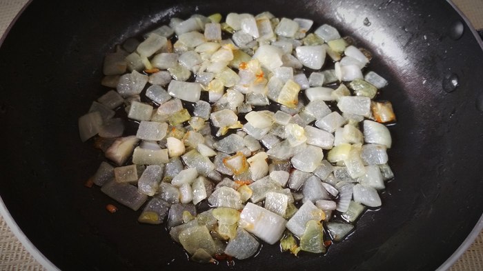 Пока варится курица займёмся подготовкой остальных ингредиентов. Лук очищаем от шелухи, нарезаем кубиками и поджариваем на растительном масле до лёгкого золотистого цвета: