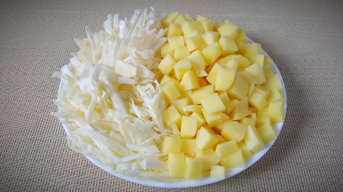 Капусту очищаем от верхних листьев, нарезаем соломкой. Картофель тоже чистим. Нарезаем его небольшими кусочками: