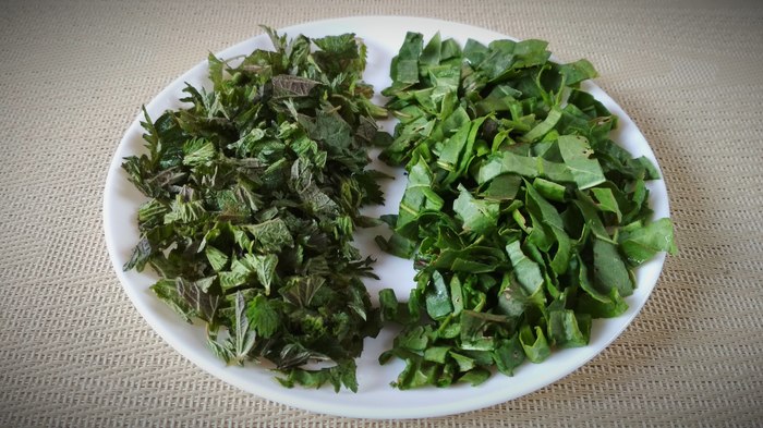 Крапиву обдаём кипятком для того, чтобы она не жглась и нарезаем. Щавель моем и тоже нарезаем: