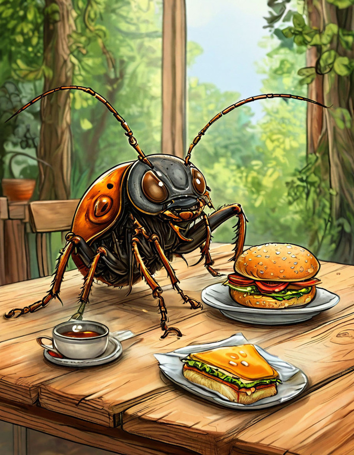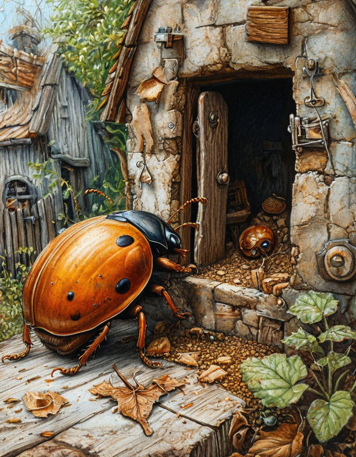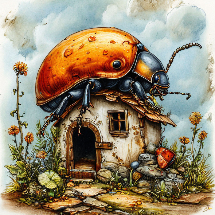 А дальше же, он искал, чего бы ему на улице попить, но так ничего и не нашёл, и отправился домой. Он уже было подумал, что ремонт в его кухне закончен, но он даже, и не начинался, как оказалось, потому что у мастеров сломалась их дрель, и им надо было покупать новые сверла, чтобы поменять нашему Жуку на кухне все плинтуса. И это ещё одно расстройство было для нашего Жука с этим ремонтом. Жук, увидев дрель у Пчёл в лапах, резко заявил, что уж, если и страдать от такого шума, и дальше, то нужно будет сразу менять и батареи, чтобы страдать уже по полной. Он даже хотел сам помочь Пчёлам с этими батареями, как, и в первый раз с краской, но они ему ответили, что ни стоит впадать в крайность! И, что из - за одного только пятна от краски на стене батареи они менять не будут! Таким образом жука привели в чувства, и снова отправили на улицу, чтобы он им не мешал, потому что сам Жук мог только пятно на стене оставить, и больше ничего. А, Жук же в свою очередь шёл по дороге с опущенными усиками, и совершенно не понимал, почему Пчелы решили менять у него дома паркет на полу, если пятно от краски на стене было. Ну, закрасили бы это пятно другим цветом, и все, готово. Так подумал Жук про весь этот ремонт. А тем временем Жуку захотелось есть, и он отправился в кафе, чтобы заказать себе какое - нибудь блюдо. И, когда официант подал ему меню, наш Жук заказал себе сырую картошку, порезанную кусочками, и ещё грушевый компот. Картошка — это потрясающая еда, которая очень понравилась нашему Жуку, и компот из груш тоже был очень вкусный. Но, к большому сожалению, Жук не наелся, когда все это съел, и он решил пойти к кому -нибудь в гости, пока у него дома гудит эта ужасная дрель. И пошёл он к Улитке. Улитка жила под большим деревом. И, ещё она очень любила заниматься выпечкой и печь печенье. И вот сегодня отведать её фирменное печенье, и отправился наш Жук. Жук постучался по домику. Ну, если быть точнее, то он, что было силы ударил маленькой палочкой по дереву, и к нему вышла его знакомая Улитка, и поздоровалась. Жук же ничего пока ни ответил, а просто прошёл внутрь этого дерева, и они вместе решили попить чай. Чай с печеньем был тоже очень вкусным, и наш уважаемый Жук, казалось наконец -то уже наелся. Потом ещё Улитка предложила поесть ему голубцы из виноградных листьев, и он от такого угощения, тоже не отказался. А время уже было 18 00 И, Улитка у него поинтересовалась, а чего же он домой то не идёт, ведь рано же утром вставать. Тут Жук ей выдал на это заявление, что, а куда - же ему идти, если у него дома работает дрель. Тут Улитка сказала, что его с удовольствием примут в муравейнике у Муравьев, и отправила его туда, и жук пошел по дорожке.