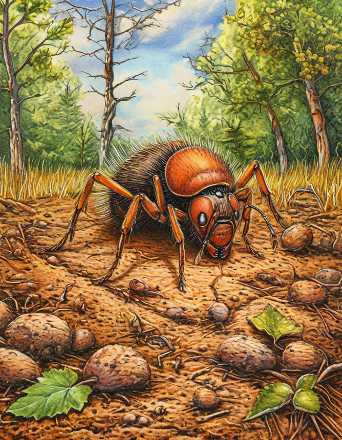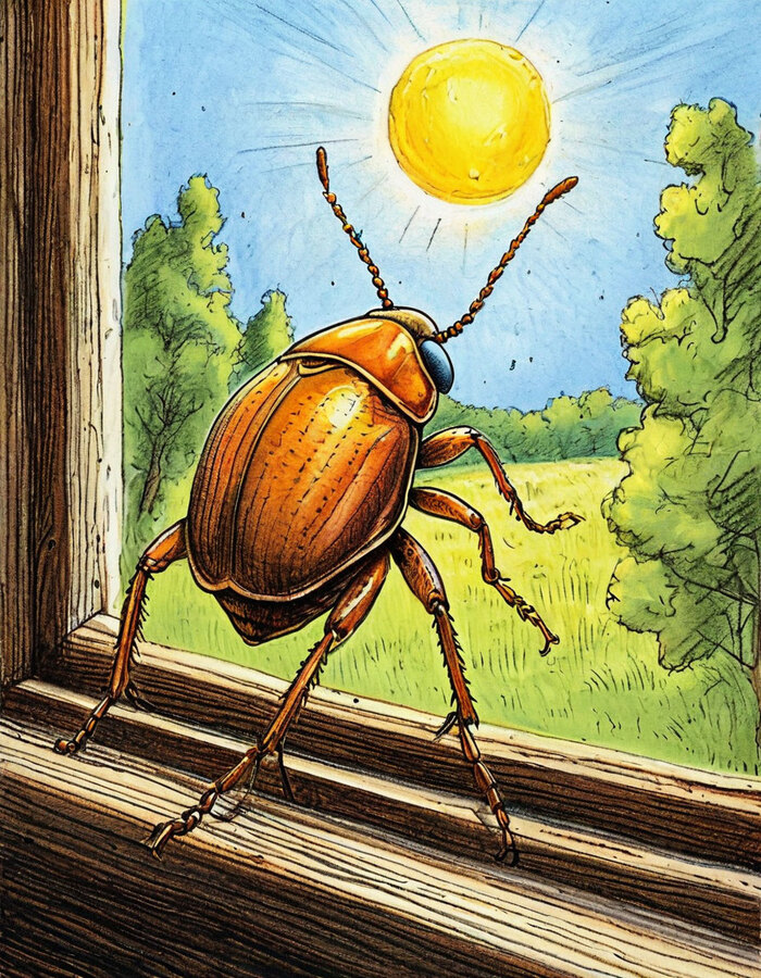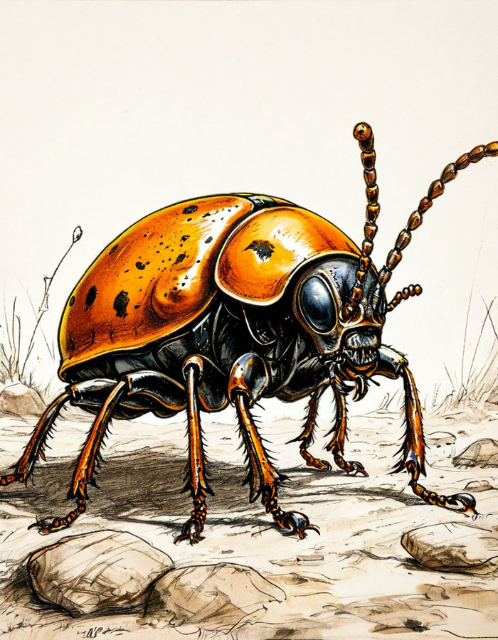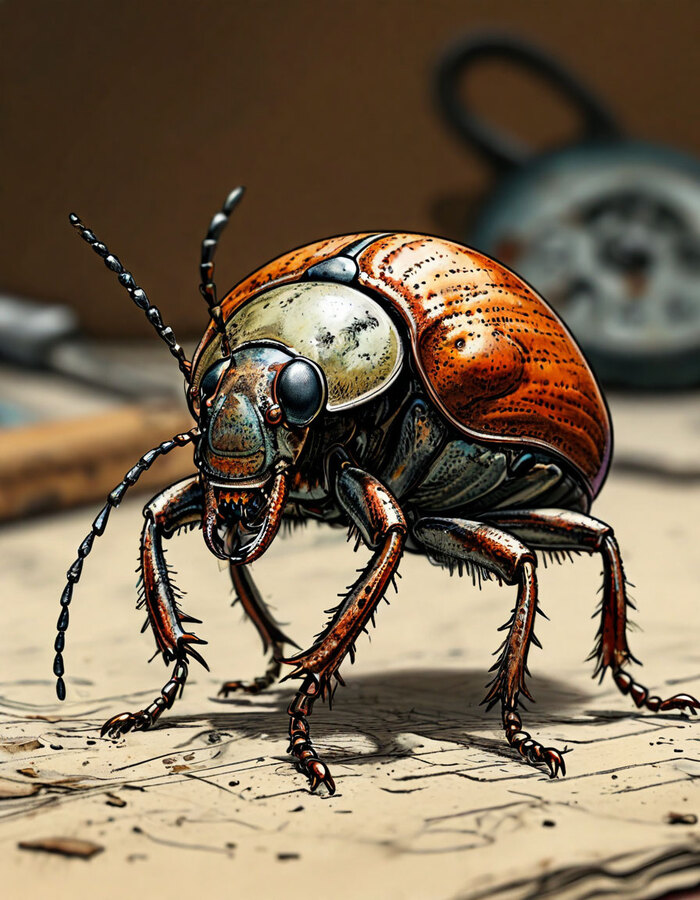 Вошедший был невысокого роста, коричневого цвета. Ярко-оранжевые глаза беспрестанно осматривали каждую деталь в помещении и других жуков. Все шесть конечностей беспокойно двигались независимо друг от друга. Казалось, ему сложно оставаться в покое даже на минуту.