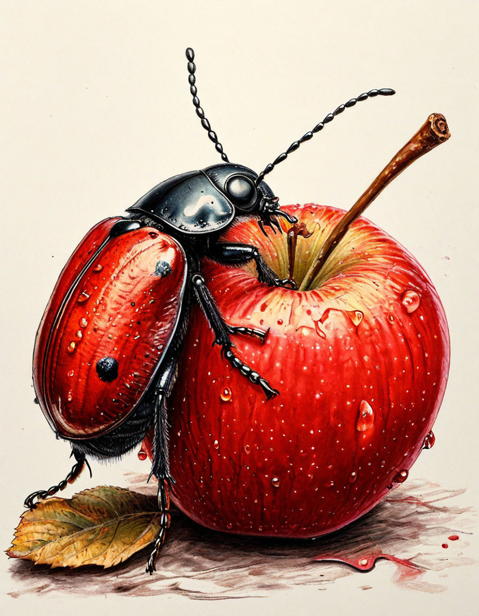 И, конечно же, вот по такому большому случаю, как покупка новых ковриков для дома, наш уважаемый Жук решил сварить большой обед, и пригласить всех своих соседей в гости. Он уже начал варить суп с лапшой, но настолько увлёкся просмотром телевизора, что, сидя на стульчике начал мешать свой суп большим половником, и незаметно для него кастрюля начала медленно передвигаться на плите, и через какое - то время, спустя минуту после того, как он положил в кастрюлю половник, она не выдержала такой тяжести, и весь его суп с лапшой оказался прямо на полу. И, что ещё хуже для нашего Жука, прямо на его новом коврике, который он, только, что купил в магазине. Первой его мыслью было ни убирать лапшу с пола, а срочно взять в свои маленькие лапки телефон, и позвонить продавцу, чтобы тот подсказал ему что нужно делать? - И, когда на линии ему ответили, что нужно все постирать, Жук переспросил, как можно такой большой коврик поместить в стиральную машинку? - Неужели сложить его пополам? Хотя, и этого по мнению Жука будет мало. - Ну, разве, что, если сложить его на три четверти хватит. Нет! - Ободряюще ему сказали на другом конце провода! Что это ни стиральная машинка будет стирать коврик, а он сам, причём своими же лапками. Тут Жук чуть не упал около своего телефона, и гордо произнёс, что у него в семье, ещё никто ковриков не стирал, и что он будет такой один, а на другом конце провода все - таки повесили трубку. - Жук взял ведёрко, собрав в него суп с лапшой, который упал вместе с кастрюлей на пол, и там ещё была и картошка. И он отнёс это все на коврике, прямо на улицу, чтобы все - таки постараться, и отстирать свою новую и дорогую покупку. – И, чтобы дело пошло ещё быстрей, Жук взял своими лапками большую щётку, и этой щёткой он начал усиленно тереть этот коврик. Тут Жуку, прямо во время стирки позвонил другой Жук, и сказал, что в такую хорошую погоду было бы неплохо посидеть в саду, ну, или же собрать урожай яблок.