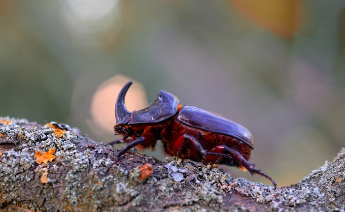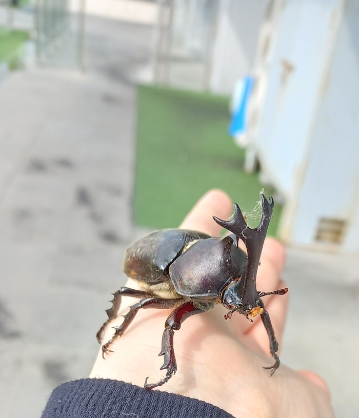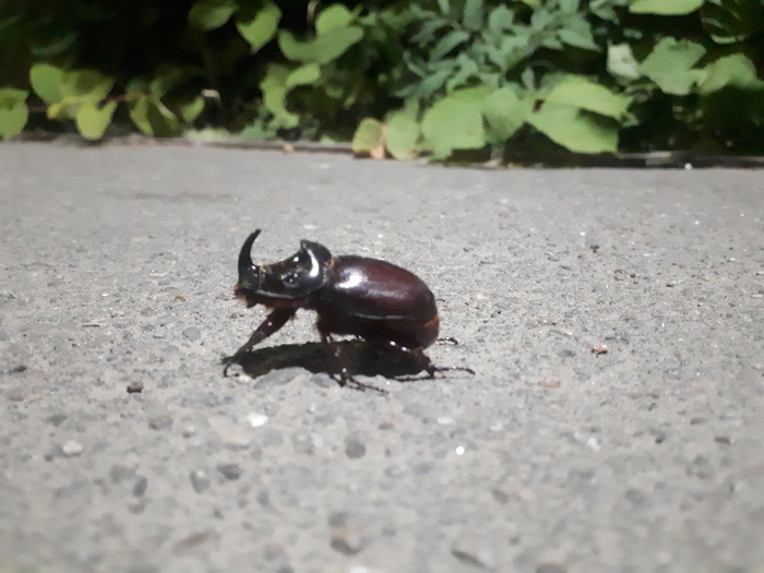 Жук-носорог в одно время был краснокнижный, сейчас вроде как нет. Самец пытался перебежать дорогу (хотя они, кажется, летают), где у него, в общем то, всё и закончилось бы. Перенесли, надеюсь, туда, куда ему нужно было.
