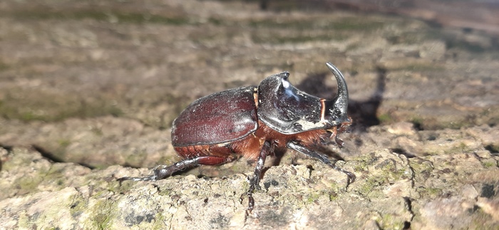 Был нещадно отфотографирован и отпущен на волю. Он залетел в дом, затем пойман в туалете. Жук носорог. Живу в Астраханской области и данный индивид довольно большая редкость в наше время. Фоткал на веранде на редми 8т