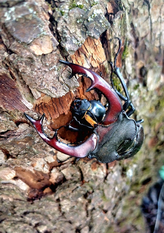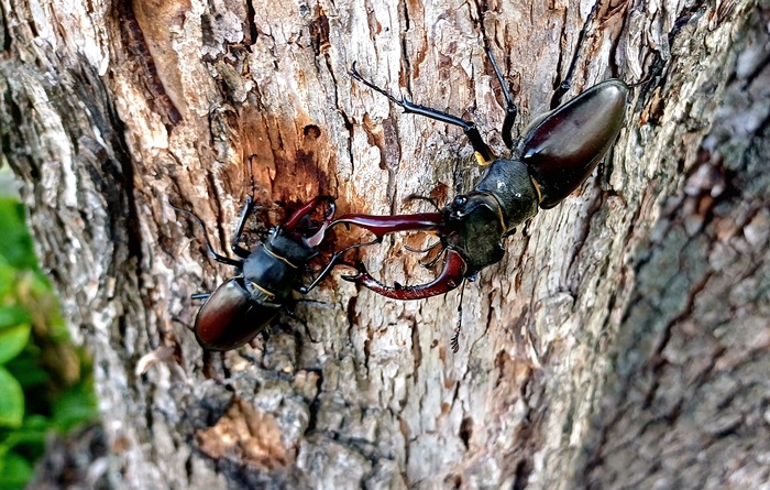 Занимались жуки обычным для себя делом - ползанием по коре в поисках дубового сока и спарингами со встретившимися "коллегами". В результате очень непродолжительных поединков, побежденные оказывались на земле.