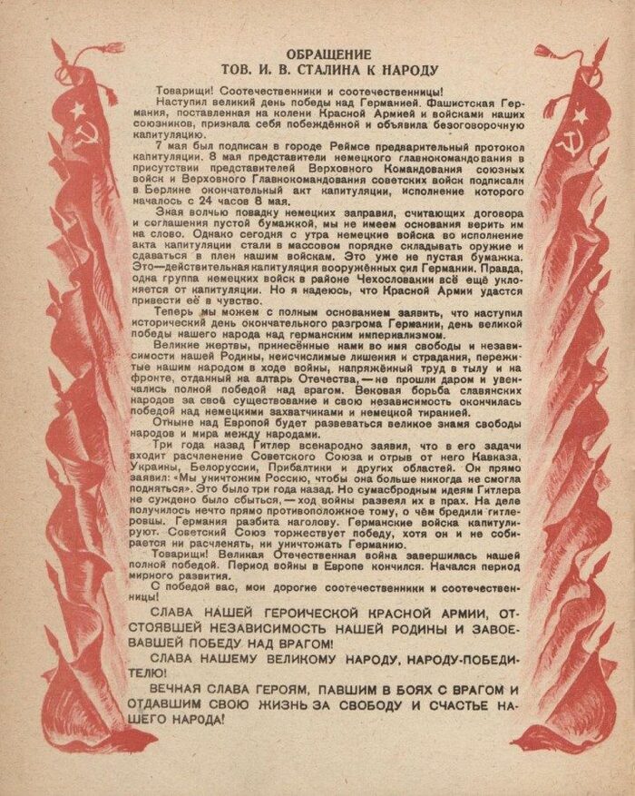 "22 июня фашистская Германия напала на священные границы нашей Родины… Нападая из-за угла, без объявления войны, кровавый правитель Германии Гитлер захотел попробовать свою силу на нас. Пусть попробует. У нас сила большая!"