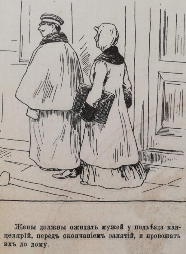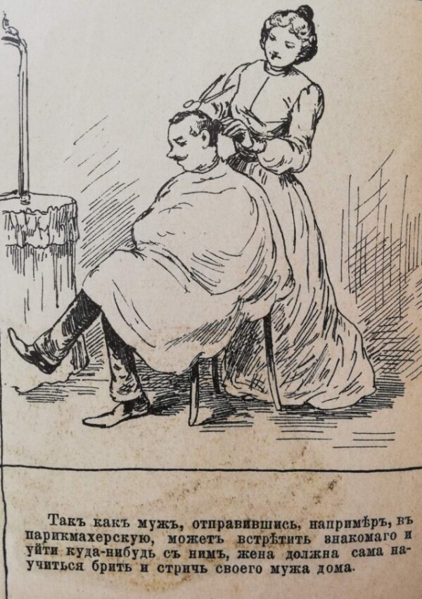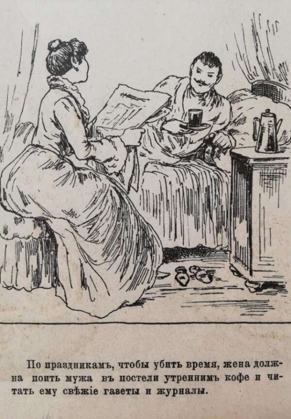 Например, пособие предлагает жене «вытирать мужу рот и усы салфеткой» и всячески поощрять его есть дома, чтобы тот «не покушался обедать в ресторане». Также «хорошая жена» 19 века должна была отгонять мух от мужа, пока тот спит после обеда. Все остальные правила также направлены на то, что жена должна всеми возможными способами угождать мужу и развлекать его. В том числе приглашать в дом «хорошеньких подруг» и позировать ему в образе нимфы.