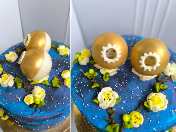 Я сделала их из шоколадной глазури, внутри фотография на вафельной бумаге. Очень хотелось отлить линзу из изомальта, но так и не удалось добиться нужной прозрачности. В итоге это к лучшему, потому что можно увидеть картинки, не снимая шары с торта.