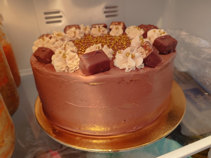 Отдельно расскажу ещё. Жена вчера-сегодня запилила по заказу родни два торта. Она любит делать торты. И умеет. Это как хобби, не для денег. По рецептам из интернета сделала наверное уже под сотню разных. Многократно вкуснее магазинных. Тот что на фото - Сникерс, другой ещё до конца не собран - кофейный что ли. Завтра утром торты заберут.