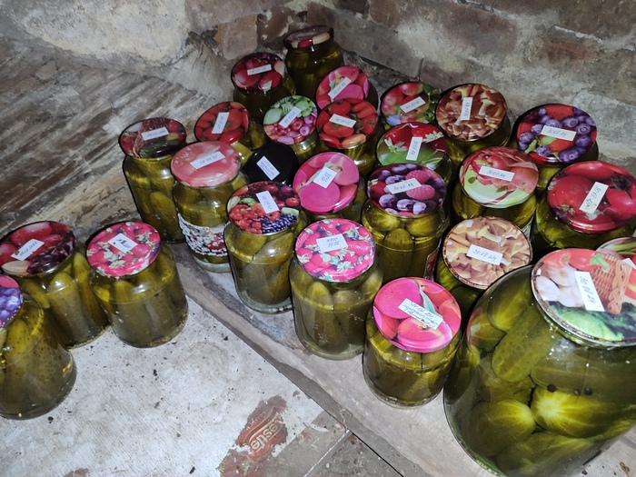 В перерыве поел в столовой лазанью, взял с собой сосиску в тесте и поехал в гараж. В гараже нужно было достать из погреба пару банок огурцов. Достал. На фото то, что осталось без учёта двух банок.