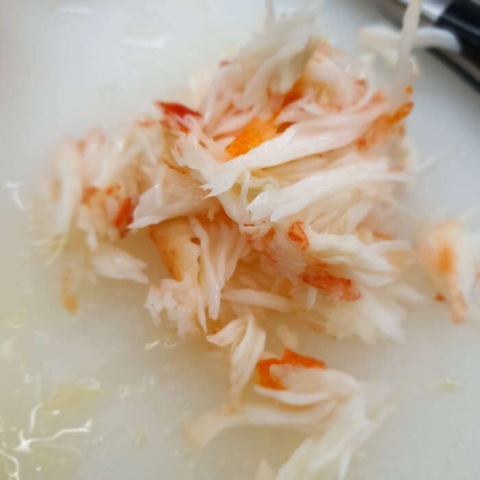В эту же сковороду в раскаленное масло положил ложку муки, прогрел, добавил молоко, добавил щепотку соли и немного мускатного ореха... Да, соус бешамель на имбирном масле получился. Загустил его чуть больше, чем обычно. Разобрал остатки краба на волокна.