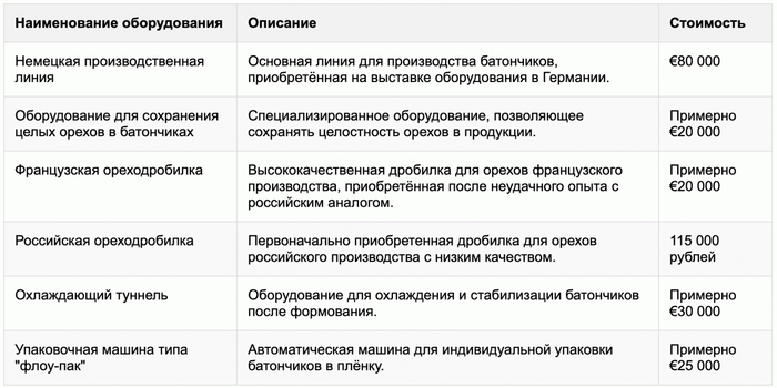 Не обошлось и без ошибок при покупке оборудования. Мы решили сэкономить и купили ореходробилку российского производства за 115 тысяч рублей. Повелись на низкую цену, но качество было ужасным. Нам в целом не очень нравится российское оборудование. Пришлось позже купить французскую ореходробилку за 1,5 млн рублей.