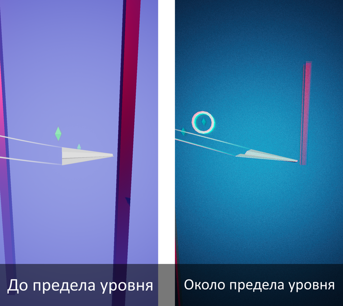 Разместил самолетик на сцене, после чего добавил ограничения, пределы полета самолетика, вылетев за которые вы проиграете. При приближении, к которым экран покрывается рябью, цвета пропадают, оставляя только черно-белые цвета. Ограничения находятся слева, справа, сверху, снизу и движутся за самолетиком по X координатам.