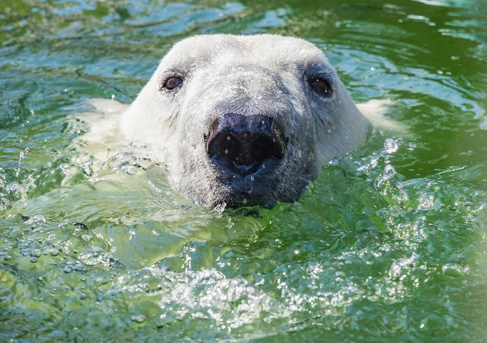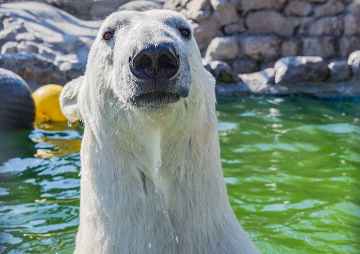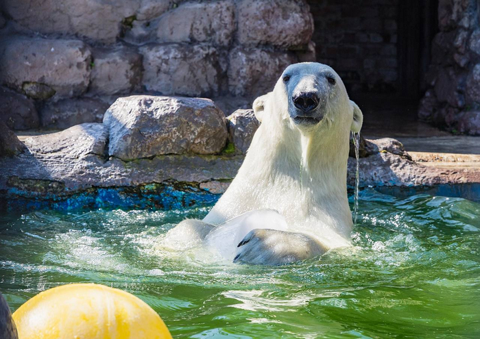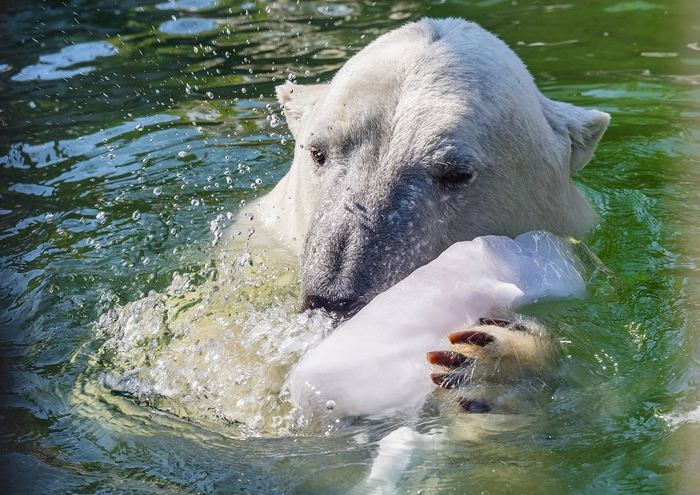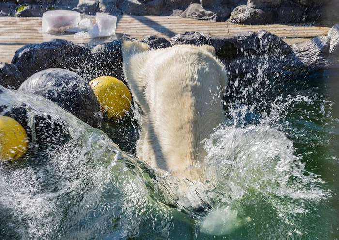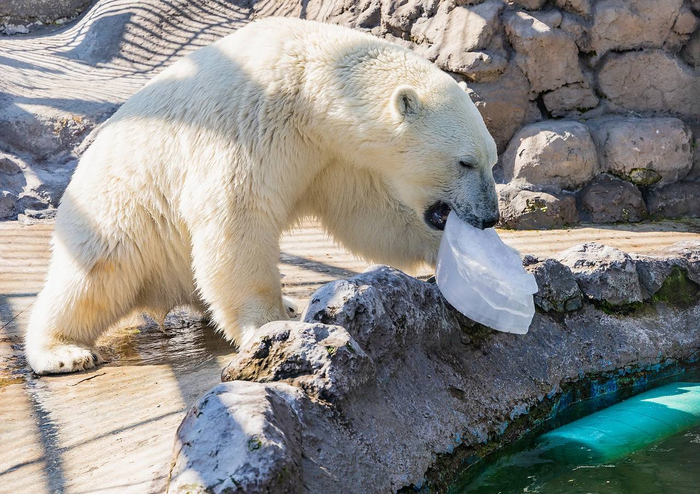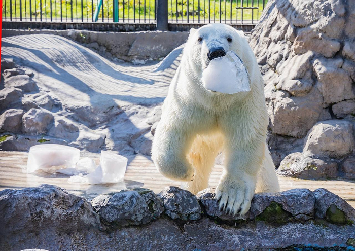 Белые медведи живут во льдах, и зимой мишку льдом не удивить. Другое дело – жарким летом. Такая холодная игрушка вызывает настоящий восторг, а для посетителей – целое шоу.