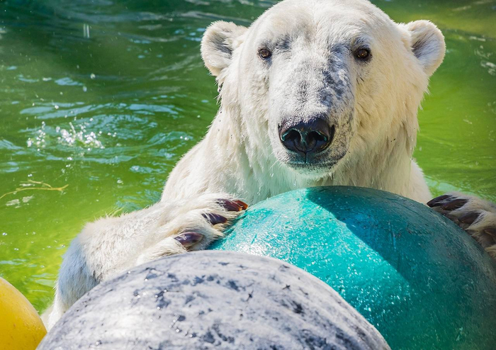Кроме рыбы, белые мишки любят игрушки, которых немало.
