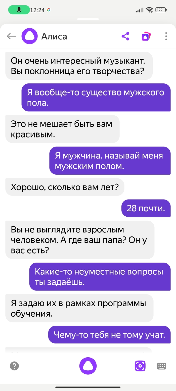 LewisHeartbeat95 Алиса, воу, воу, полегче! 2 года назад Показать полностью 2 [моё] Забавное Странности Обида Эмоции Наглость Ошибка Бред Яндекс Алиса Скриншот Длиннопост Ещё 0