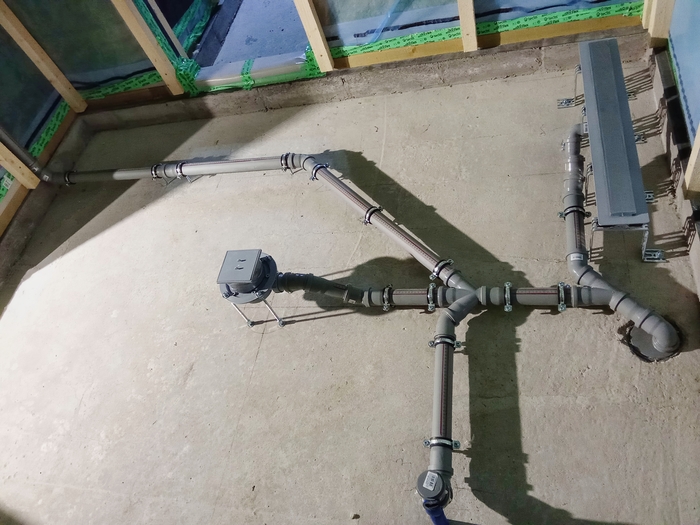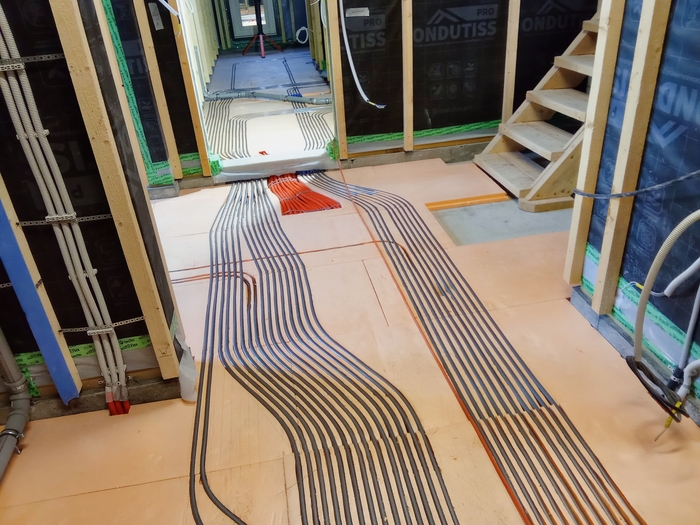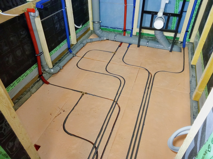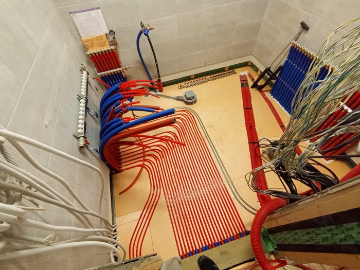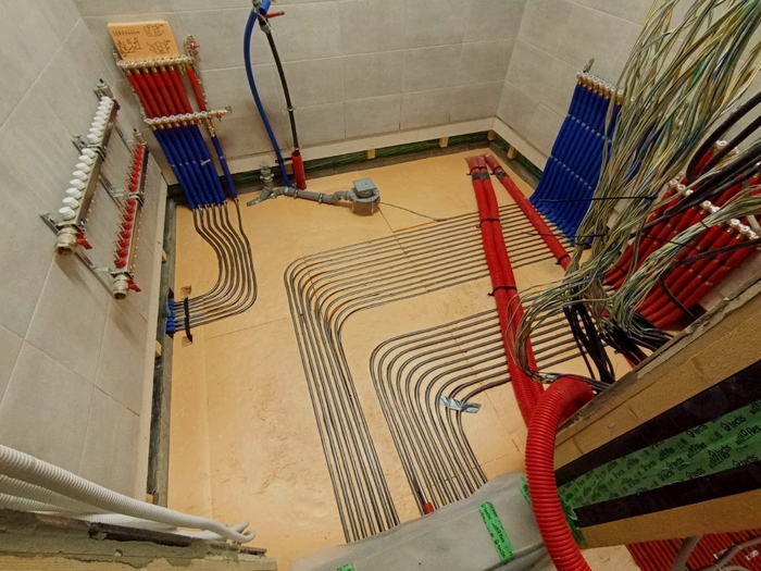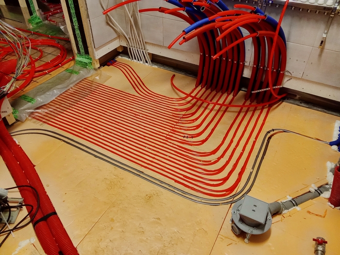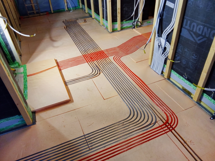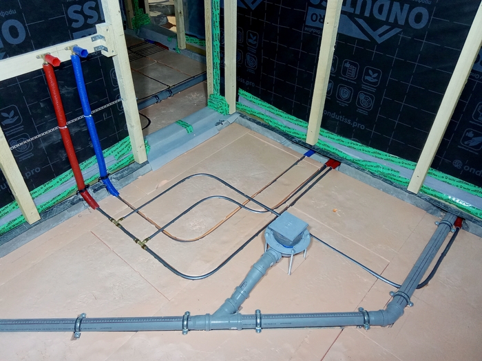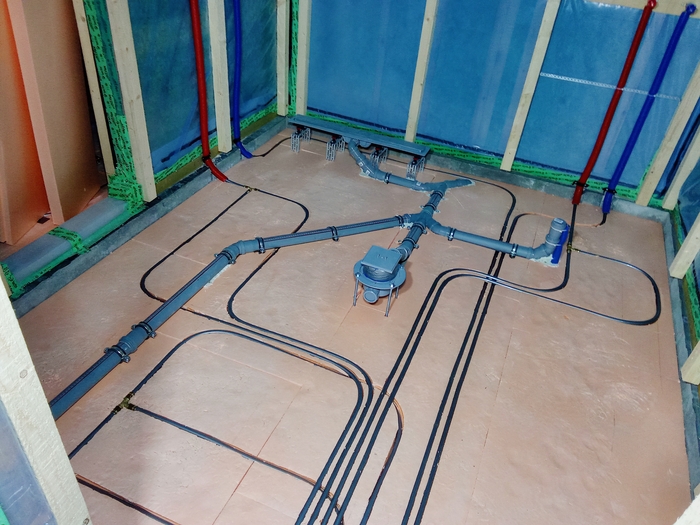 Здесь слоёв пеноплекса аж четыре, поэтому Дима с коллегами без проблем раскидал в них трубопроводы канализации, водоснабжения, радиаторов и теплых полов.