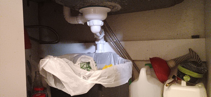 Вы скажете - отлично! А я отвечу - мы можем сделать ещё лучше! Мы убрали болтающуюся гофру, это здорово. Но как вам идея - убрать этот торчащий прямо по центру тумбы сифон? По мне, не очень-то удобно, когда ты не можешь поставить нормальное мусорное ведро или вынужден ущемлять пакет с пакетами, постоянно толкая его в сторону. Я вижу, что вы уже готовы получить это секретное знание. Итак, представляю вам отвод для мойки со смещением!