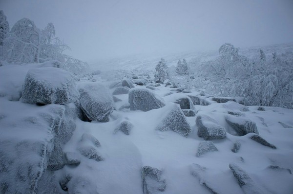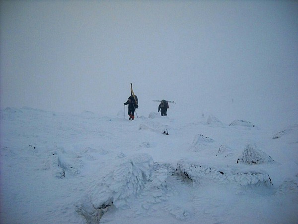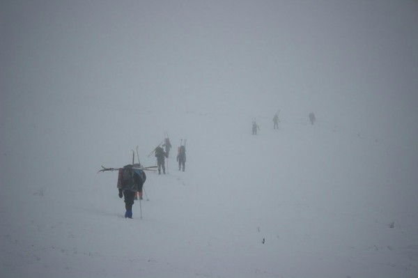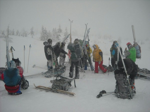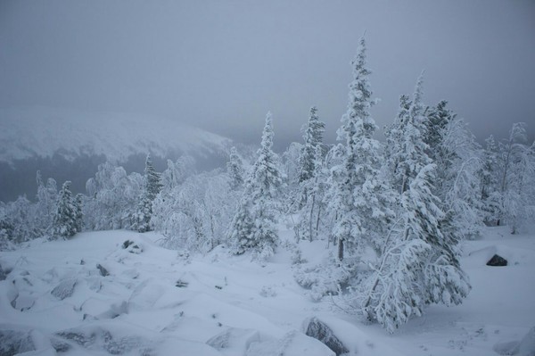 Полтора часа безуспешных поисков. Поняв, что вряд ли кого найдем на обширном Иовском плато в такую пургу решили спускаться с Конжака по марафонской трассе, благо что вешки этой трассы нашлись буквально в двух шагах от каменюки за которой мы прятались. Чем ниже спускались по марафонке тем тише дул ветер, а в лесу и вовсе стих. Облепленные снегом участники похода собрались на экстренное совещание, где постановили оставить группу для встречи отставших, на случай если они вдруг выйдут сами, а всем прочим двигаться в направлении к автобусу должному нас ожидать как раз в конце марафонки. Там по возможности скорее оповестить МЧС о произошедшем чп.