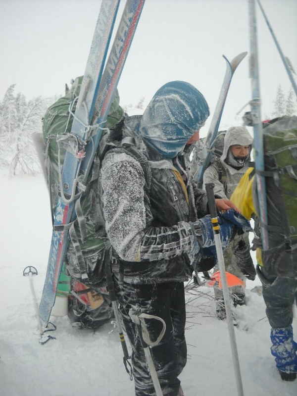 Тут-то оно и началось. Буквально в течении пяти минут кругом завертелась такая снежная круговерть, что видимость тотчас упала до десяти метров. Слышимость упала до нуля, бешеный ветер срывал слова прямо с губ и уносил куда-то вглубь Уральских гор минуя уши собеседника. А вот и чья-то сорванная с рюкзака сидушка пролетела вслед за словами. Естественно, что все три группы моментально оказались разделены меж собой плотной стеной снега и ветра. Сбившись поплотнее мы укрылись за небольшим скальным выступом. Пару минут посовещавшись, отправились на поиски отставших забив в навигаторе точку.Почти сразу нашли людей из средней группы, оставалось отыскать еще троих из замыкающей.