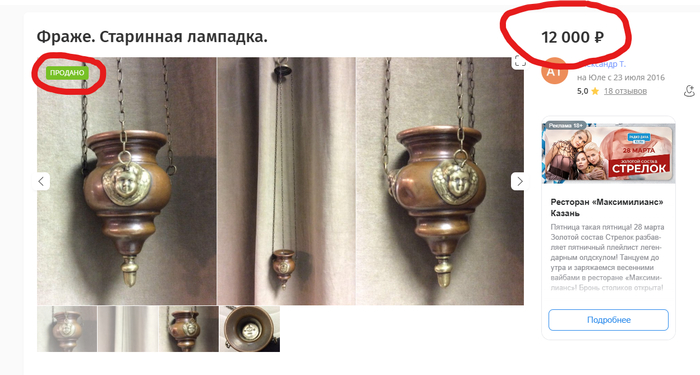 Лампада такого же типа, была продана за 12000 рублей. Так, что на данный момент - это самая дорогая находка из тумбочек, что я доставал. Что с ней делать - пока не знаю.
