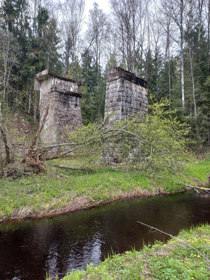 И, наконец, уже перед Веймарном на реке Хревица рядом с деревней Ястребино можно увидеть руины железнодорожного моста N 59° 22.386'E 28° 57.150'. Руины заросли и на фотографии практически не видны из-за зарослей.