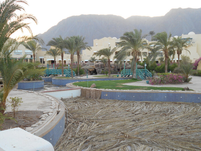 Здесь всё оказалось не так страшно: отель не работал давно и вид был соответствующий. Бассейны были наполнены ветками и листьями от пальм.