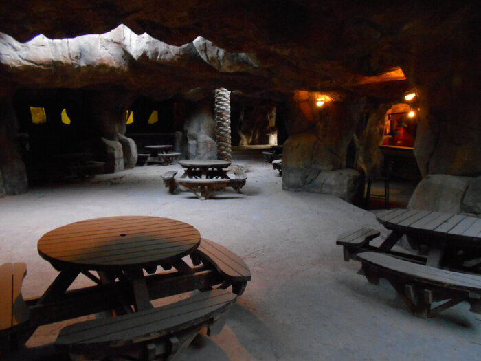 А потом мы попали в грот, точнее бар. Пыль, толщиной с палец, белого цвета. Грязные, перевёрнутые столы. Стало наглядно видно, что бывает , когда перестают эксплуатировать объект.