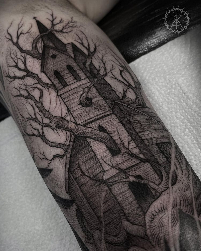 - Приехали…- вздохнула Анна. Навигатор упорно показывал именно этот путь, до дома оставалось метров пятьсот. Заглушив мотор, некоторое время она посидела в машине, собираясь с духом. «Скоро совсем стемнеет, необходимо добраться до дома пока не наступила ночь» - решив так, она взяла красный фонарик и решительно вышла из машины. Её тут же окутала мрачная атмосфера места. Ветер утих, деревья стояли не шелохнувшись. Казалось, весь мир замер в ожидании. Нервно оглядываясь, Анна, следуя навигатору, продвигалась в чащу леса. Перейдя через мост, и чудом не упав в ручей, она оказалась с другой стороны от машины. Переступая с ноги на ногу и чавкая грязью, она подумывала вернуться, но отступиться от цели она не решилась. Упорно находя среди высокой травы тропинку, она выключила навигатор и, включив фонарь, уже ориентировалась по ней. В небе сверкнула молния. От неожиданности Анна вся вздрогнула. Но успела разглядеть вдалеке очертание какого-то строения. Чем ближе она подходила, тем выше поднимался туман. Вскоре даже свет фонаря не позволял разглядеть дальше пары шагов. Вечернюю тишину время от времени стали пронизывать странные звуки, казалось, издали доносится тоскливая мелодия. Это не на шутку встревожило женщину. Подойдя почти вплотную, она наконец-то смогла оценить дом. Двухэтажный дом был весь в облупившейся краске, сложно было понять, какого цвета он был раньше. Окна рядом с дверью были выложены из цветной мозаики, удивительно как они до сих пор сохранились. Дёрнув дверь дома на себя несколько раз, ей удалось попасть в дом. Найдя выключатель рядом с дверью, она щёлкнула рычажок.
