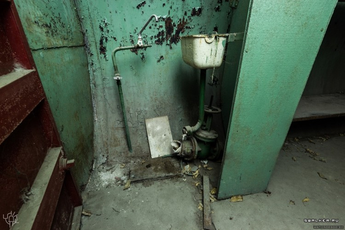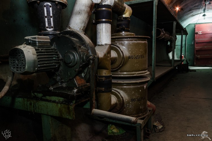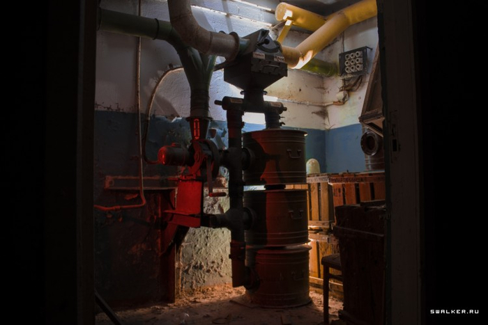 Также в защитном сооружении должен быть санузел и баки с запасной питьевой и технической водой, но всё это успешно было сдано в пункт приёмки металлолома или просто выброшено. Зато на своём законном месте фильтро-вентиляционная система. Даже сами фильтры-бочонки ещё на месте.