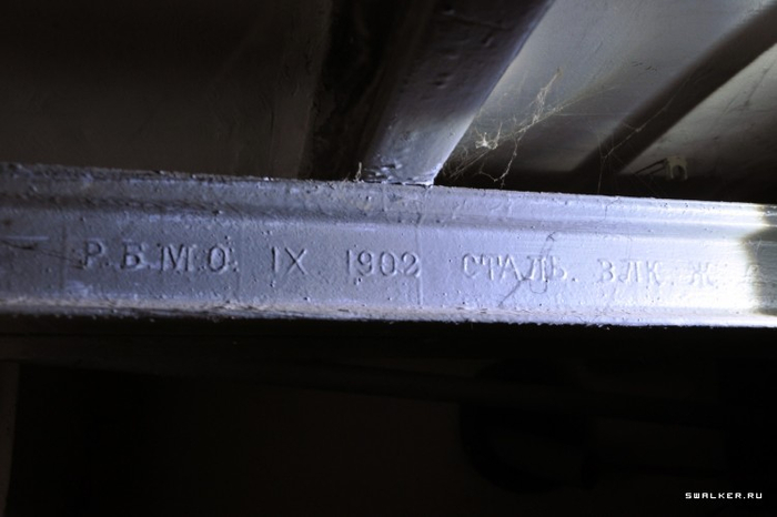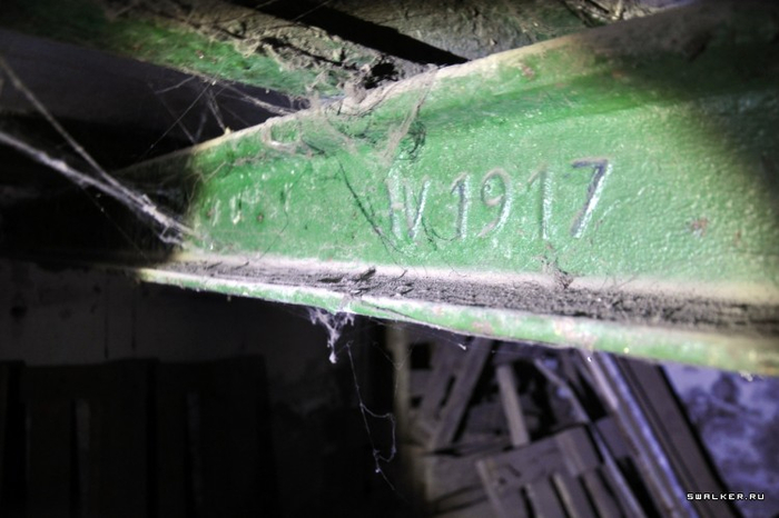 Вот, кстати, находка над головой - перекрытия подвала сделаны из старых рельс, на которых имеются клейма за 1902 и 1917 год.