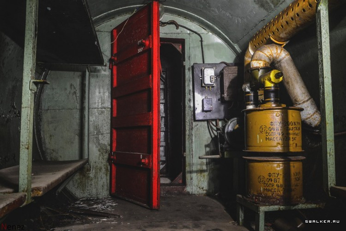 Дизельного генератора здесь не предусматривалось, поэтому защитное сооружение пользовалось только внешними источниками электроснабжения. В противоположном конце бочки имеется ребристая гермо-дверь, как в поддомнике в самом начале обзора.