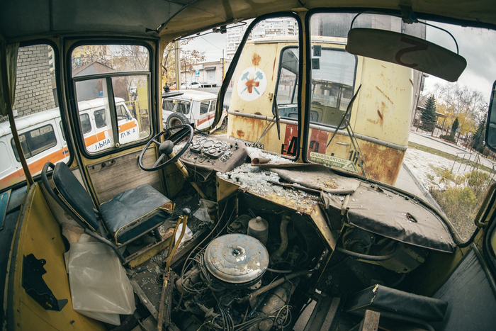 Перед нами открылось необычное зрелище: огромное количество техники почти на любой вкус! Тут были и автобусы, и пожарные ЗИЛы, и подготовленные когда-то к бою буханка и коротки УАЗ. Вся техника в удручающем состоянии, окна частично побиты, внутри самих машин натуральная помойка. По факту технику ВГСЧ вполне реально восстановить, но надо ли им это?