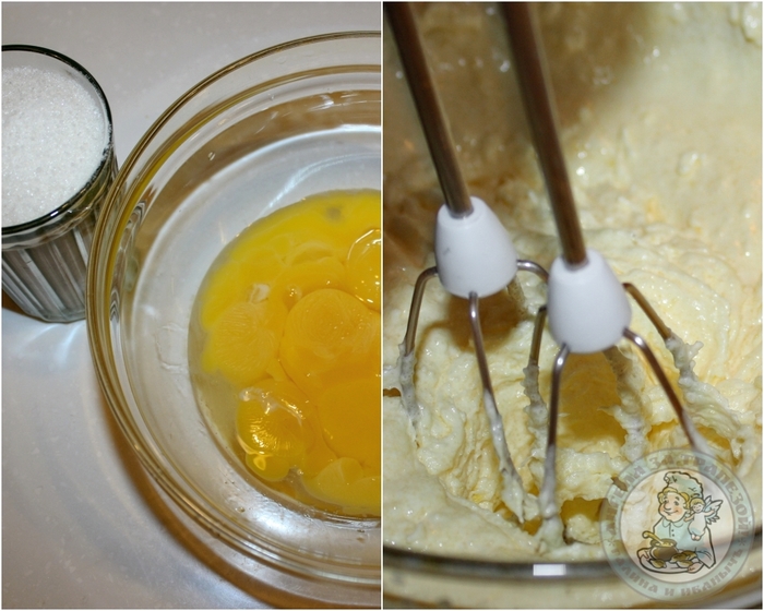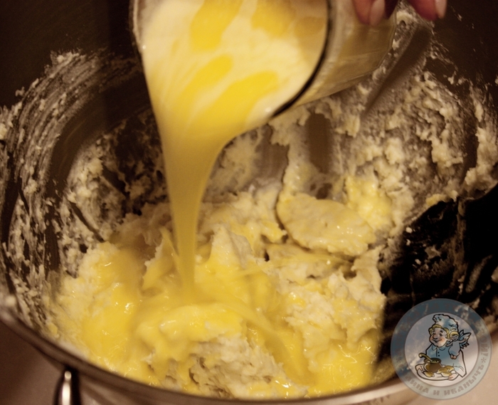 Взбиваем масло с сахаром в крем (если я не ошибаюсь, этот этап так и называется - криминг). Это придает готовым кексам нежную, пористую текстуру. Вбиваем, продолжая взбивать, яйца по одному.