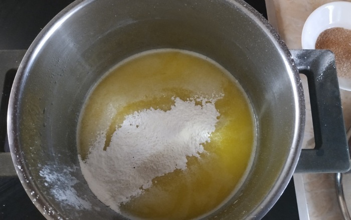 1. Высыпаем в скородку сахар и на среднем огне, не торопясь, нагреваем его. Дожидаемся, пока края не начнут таять. Следите! Сахар очень быстро коричневеет, и нам надо, чтоб он растаял весь прежде, чем начнет гореть!