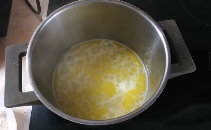 2. Добавляем в готовый сироп холодное масло и подогретые сливки. Вот я уже постфактум прочитала - изучала свои ошибки - что сливки надо нагреть до кипения. У меня были просто теплые, и как вы понимаете, от резкого падения температуры сироп немедленно застыл в леденец. Получилась такая масляно-сливочная жижа с кусками тягучей карамельки на дне. Рукалицо.